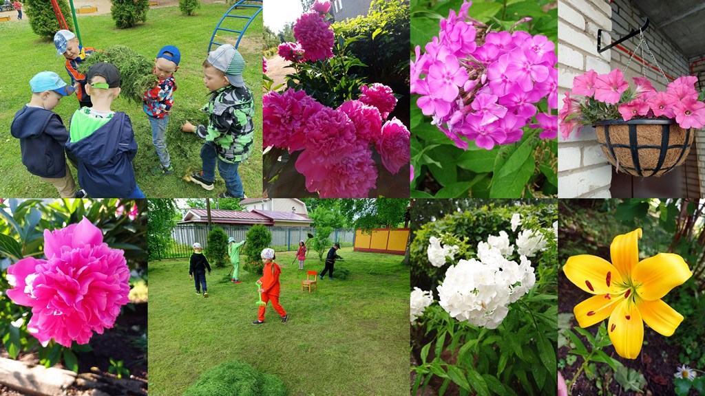 Наши дети живут в мире летней красоты! Детский сад встречает своих воспитанников яркими тюльпанами, нежными флоксами, пышными пионами. Зеленеют туи и подрастают каштаны, роскошную зелень листвы дарят берёзки и осинки. Благоухает ароматом черёмуха, всеми оттенками зелёного сияет идеально подстриженный газон. Сотрудники детского сада уделяют большое внимание благоустройству территории. Но и дети не остаются в стороне, они всегда с энтузиазмом помогают взрослым.
