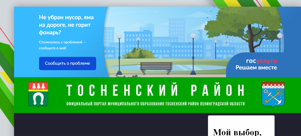 На официальном портале муниципального образования Тосненский район Ленинградской области вы можете ознакомиться с важной информацией, сообщить о проблеме, задать вопрос. Кликните по картинке и перейдите на сайт!
