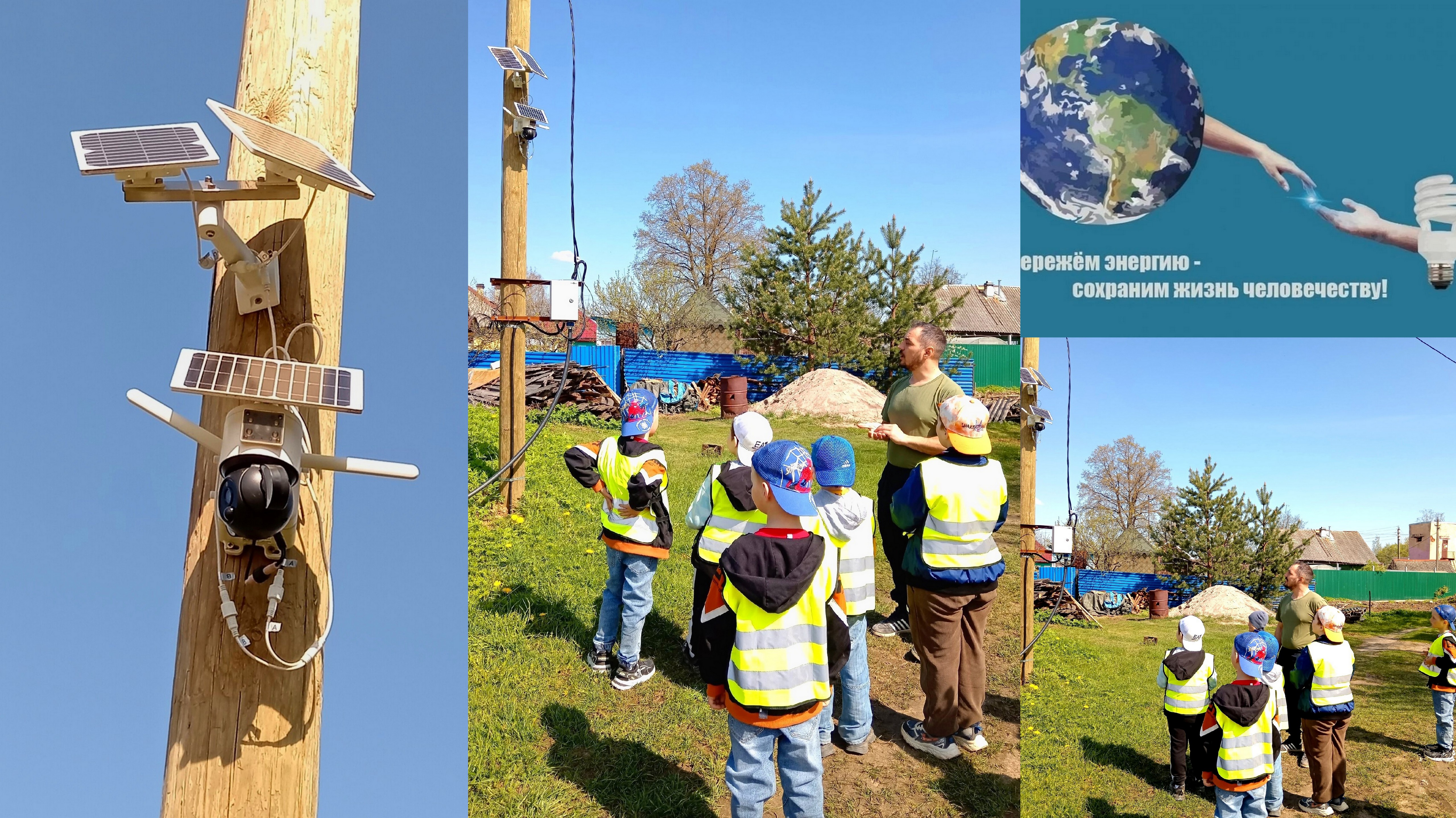 Владимир Александрович показал и рассказал детям, как он использует солнечные батареи для работы видеокамеры, установленной у него на участке. Эти батареи развёрнуты по ходу движения солнца, чтобы поймать максимально возможное количество солнечного света.