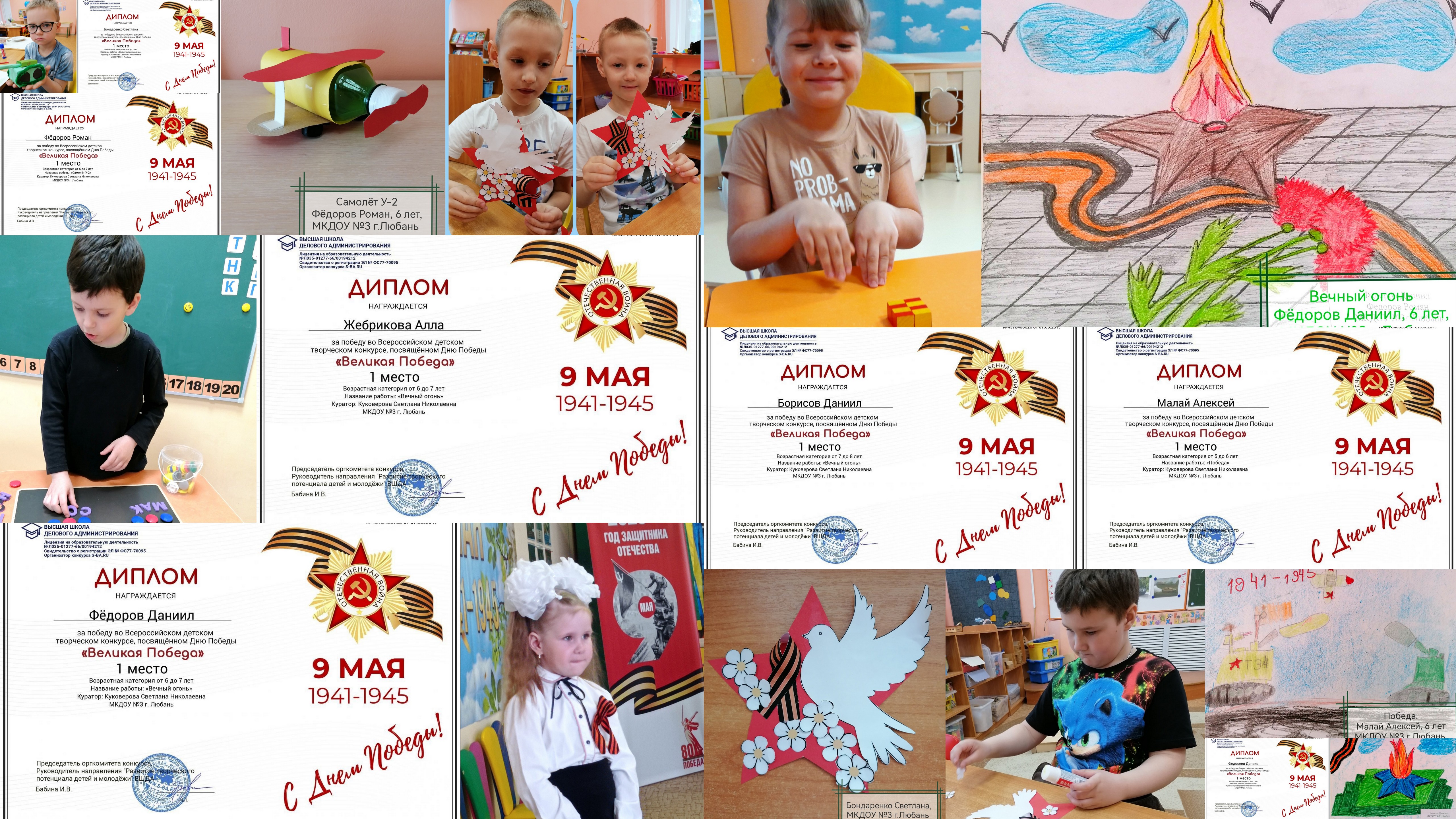 Воспитанники группы компенсирующей направленности для детей с тяжёлыми нарушениями речи стали победителями Всероссийского детского творческого конкурсе "Великая Победа"! Поздравляем ребят! Благодарим учителя-логопеда Куковерову Светлану Николаевну за организацию участия детей в конкурсе, создание условий для разнообразной творческой деятельности детей, приуроченной к 80-ой годовщине Великой Победы!