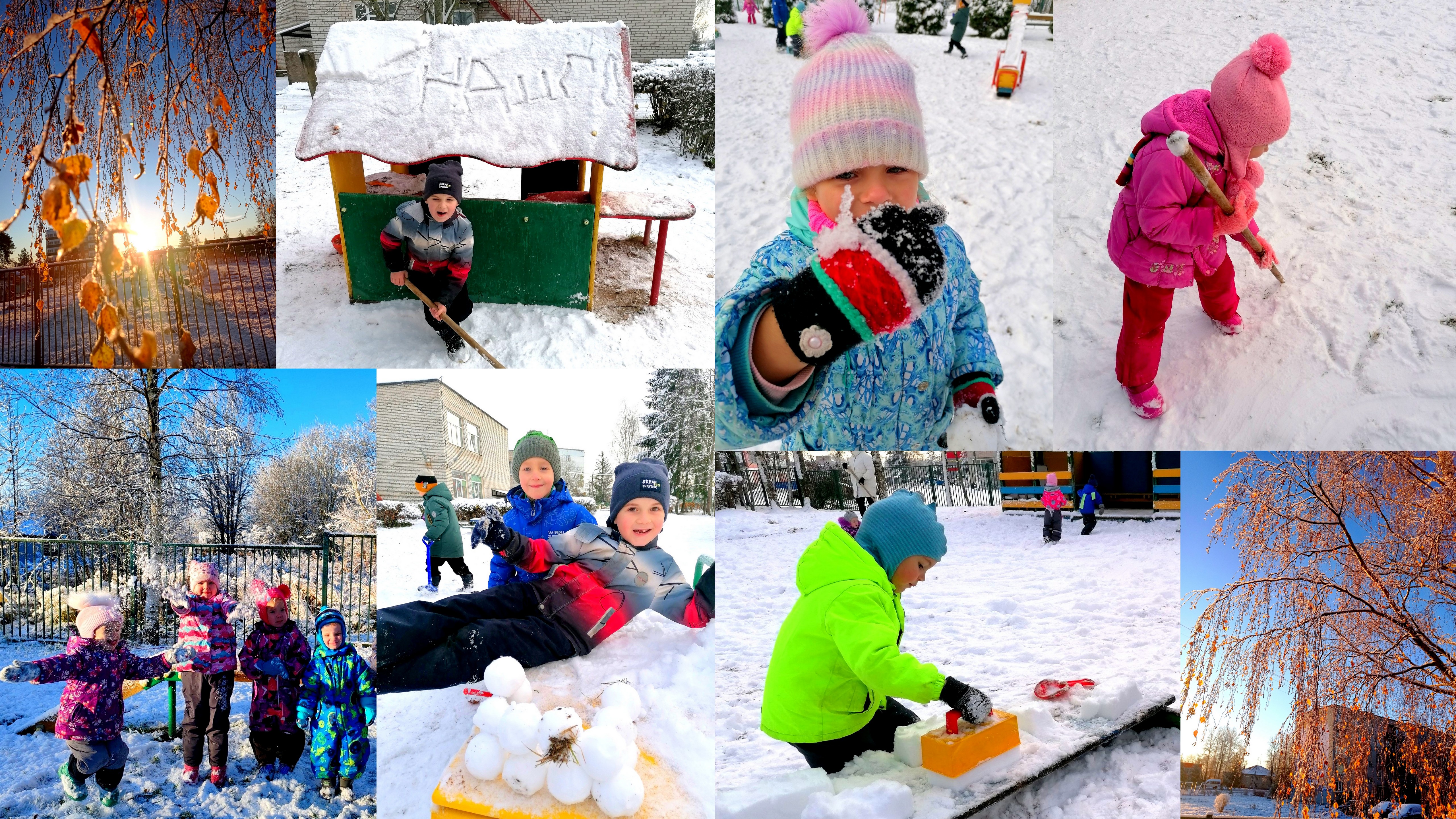 "А как много можно сделать из снега! И снежки слепить (хоть снег пока плохо лепится), и построить мини крепость, и налепить кирпичей. А ещё можно найти огромный карандаш, а потом писать буквы. А в льдинках можно увидеть и петушка, и замок..."