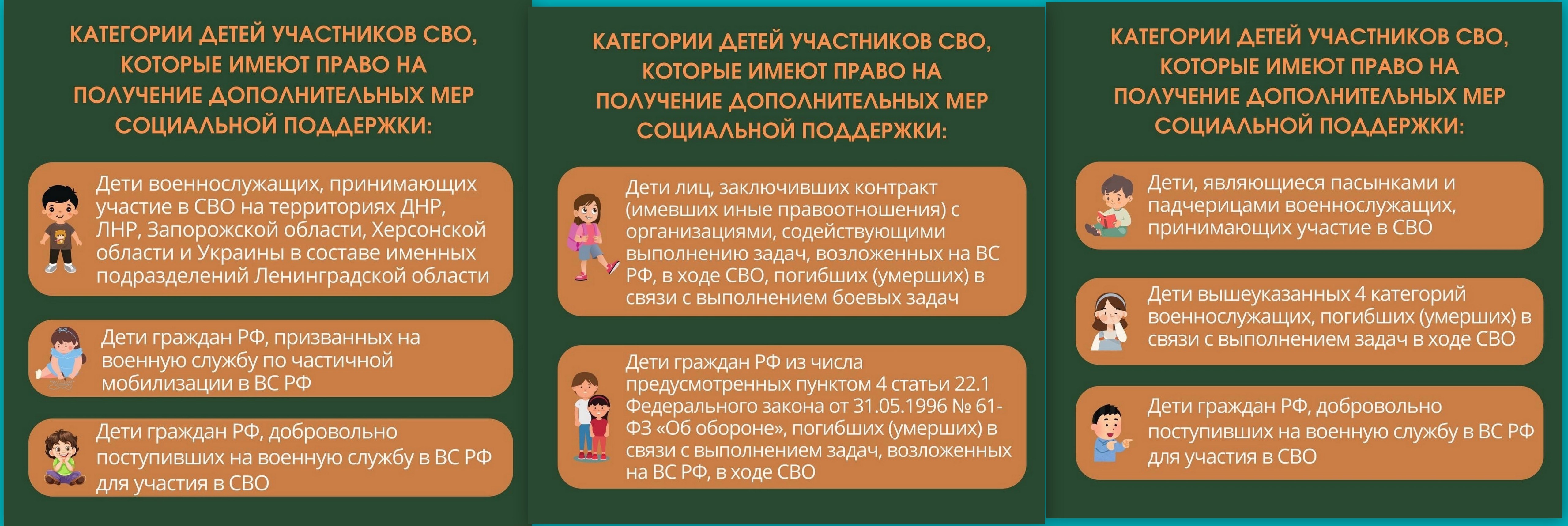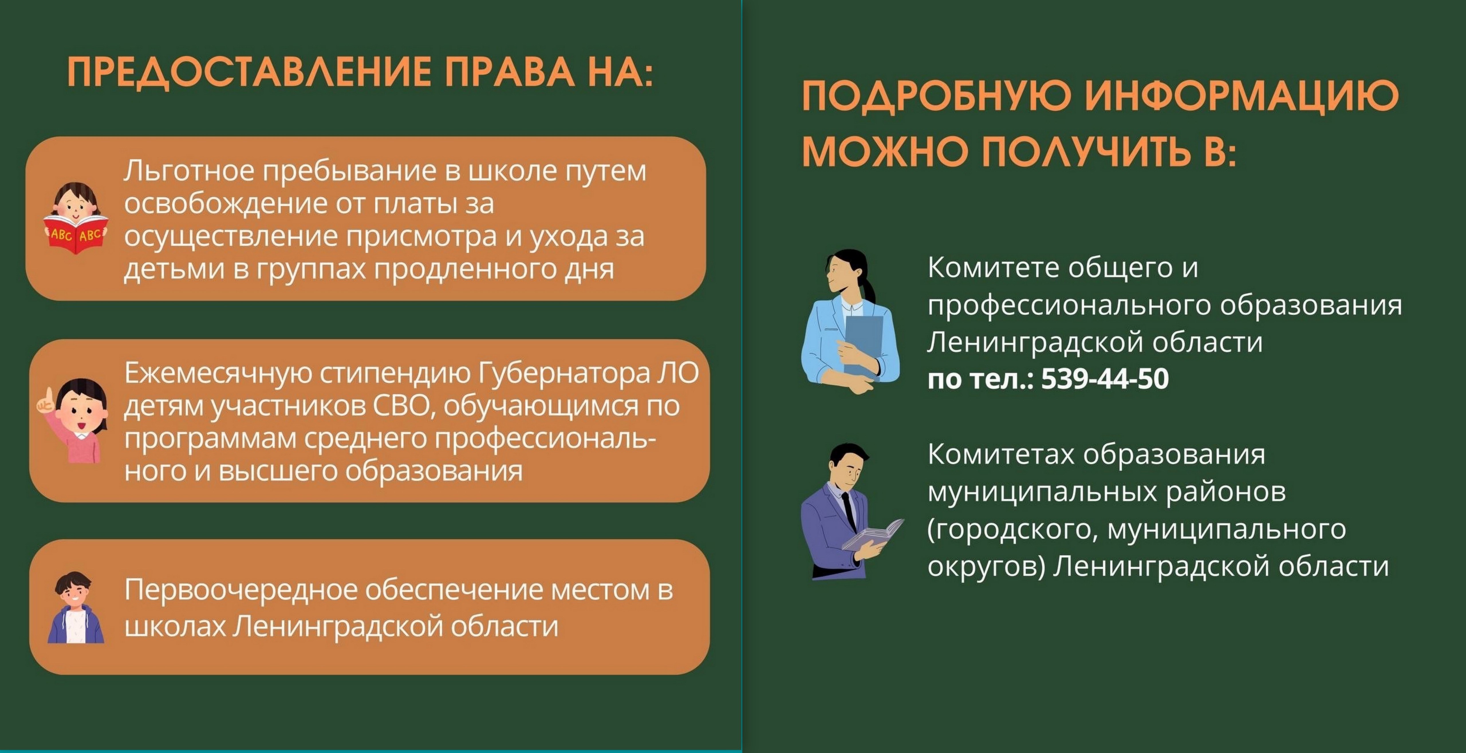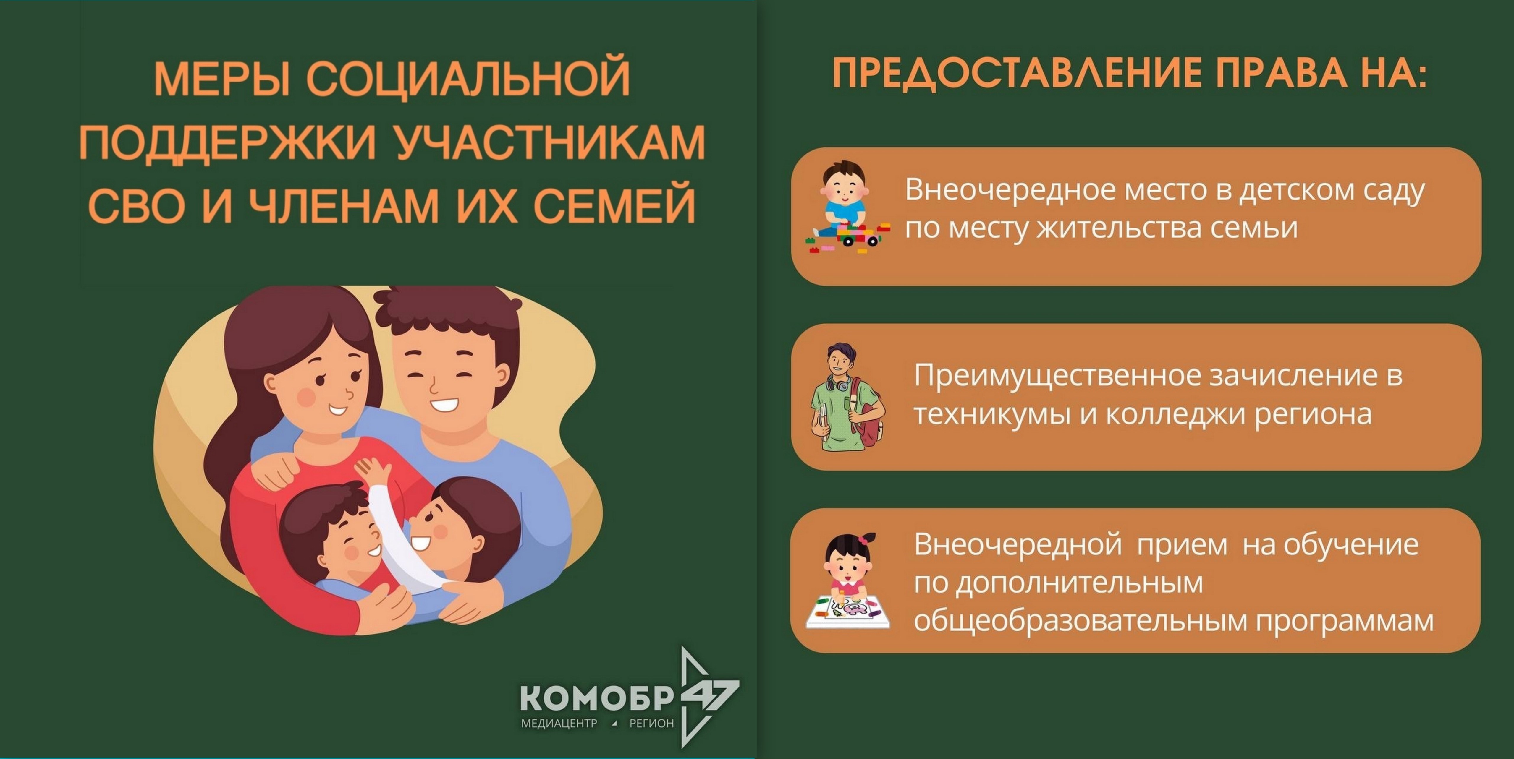 Ленобласть продолжает оказывать всестороннюю поддержку участникам СВО и их семьям. Для жителей Ленобласти предусмотрено более 65 региональных льгот и компенсаций, 13 из которых касаются сферы образования, воспитания, отдыха и оздоровления детей. Какими мерами могут воспользоваться семьи участников СВО, кто имеет право на получение дополнительных мер социальной поддержки и куда обращаться за помощью - в наших карточках.