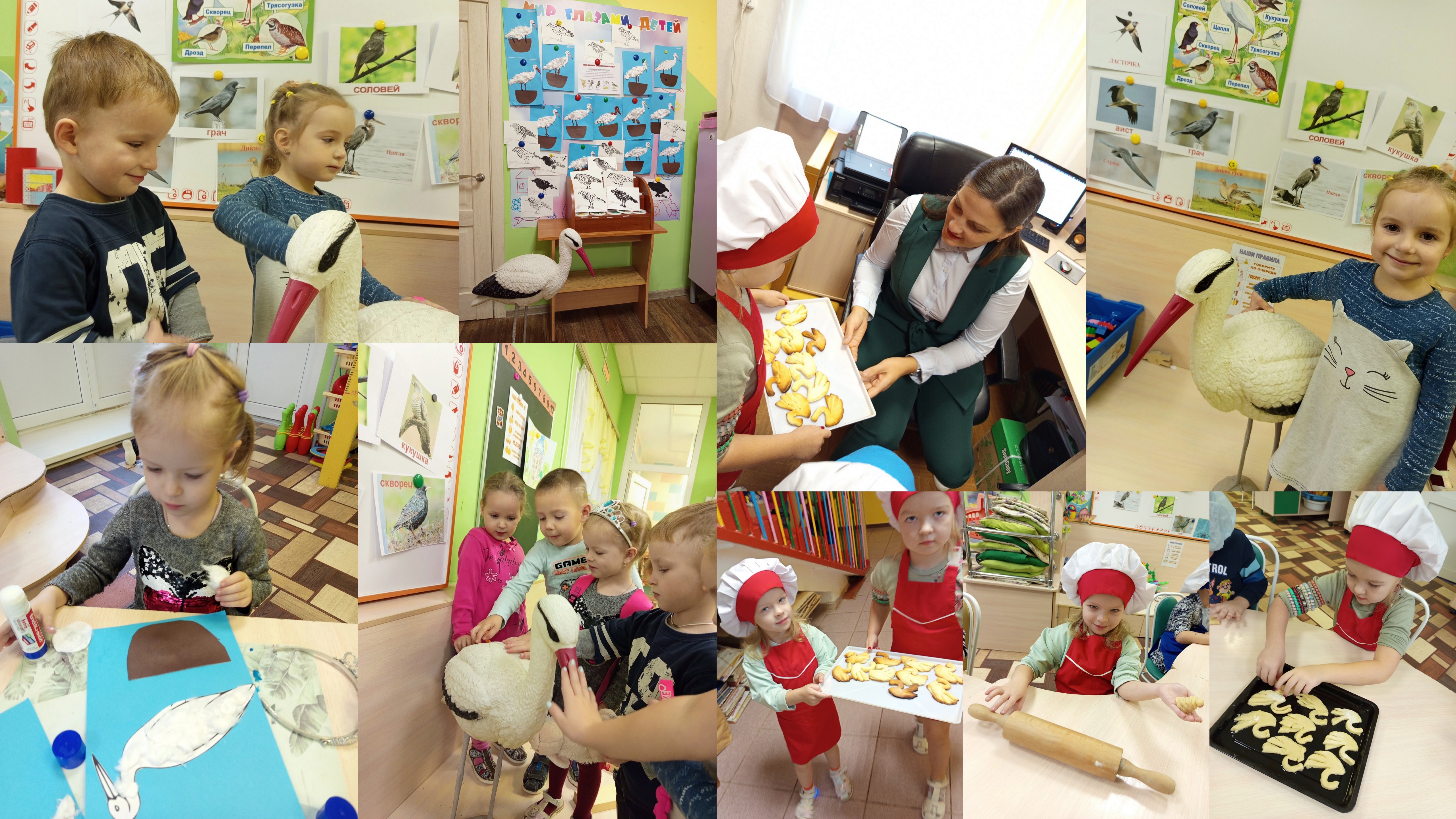 Педагоги Васильева Татьяна Сергеевна и Зуева Екатерина Викторовна, поддержав интерес детей, пригласили в гости аиста Гошу (так дети назвали большого игрушечного аиста, которого воспитатели принесли в группу), и вместе с ним совершили путешествие в мир птиц. Каждый день Гоша давал детям интересные задания, которые они охотно выполняли. Дети с нетерпением ждали новых увлекательных историй о жизни птиц, делились впечатлениями о наблюдениях за ними.
