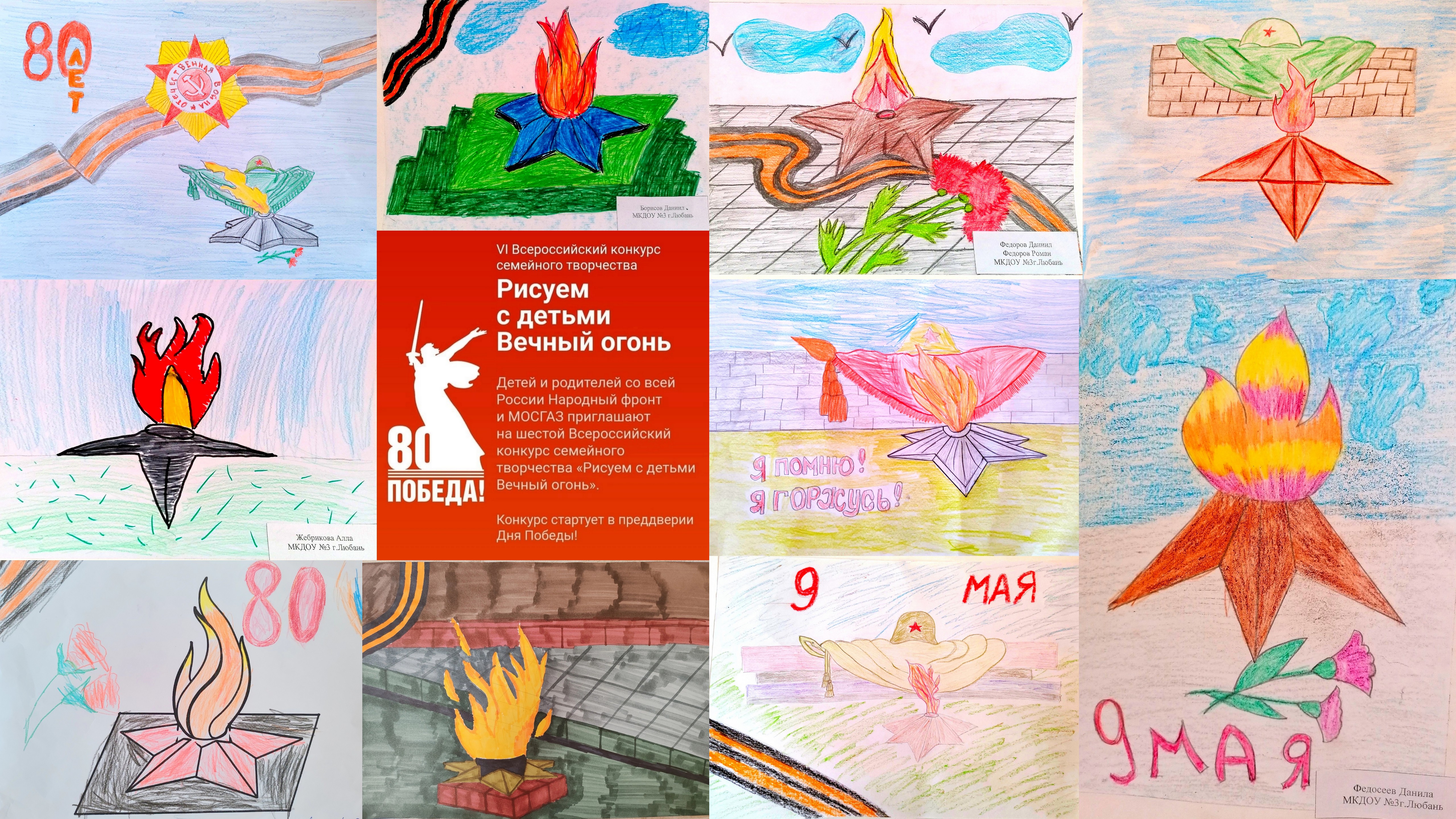 Воспитанники нашего детского сада принимают активное участие во Всероссийском конкурсе семейного творчества "Рисуем с детьми Вечный огонь". Сохраним огонь победы!