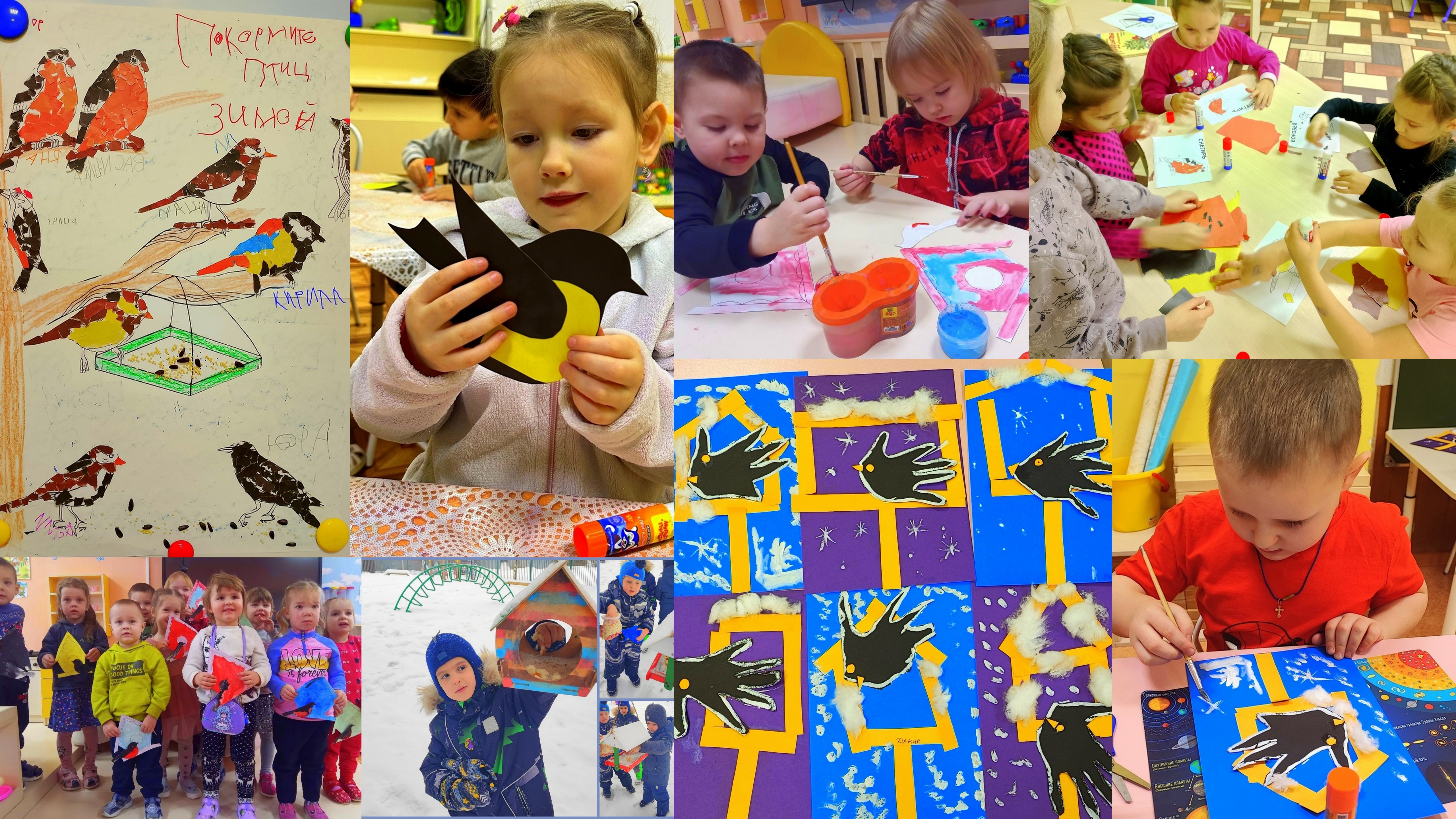 Сегодняшний день в нашем детском саду посвящен зимующим птицам! Ребята оформляли плакат, делали аппликации, рисовали птиц, а также пополнили свои знания о зимующих птицах нашей местности. Слушали стихи и обсуждали приметы, связанные с птицами. Отгадывали загадки и рассматривали «птичьи» картинки, говорили о необходимости помощи человека птицам в зимнее время и о правилах подкормки птиц.