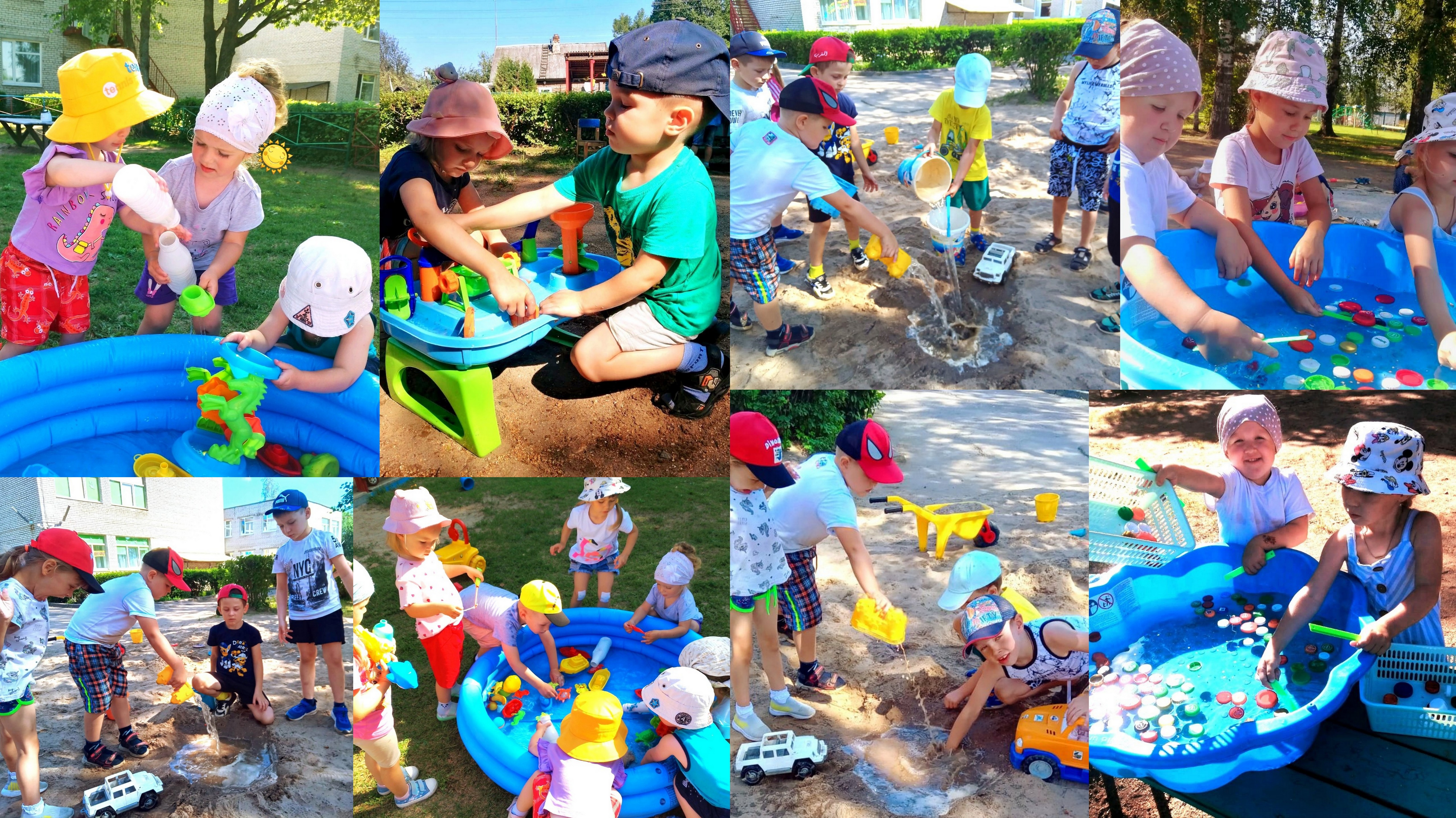 В нашем учреждении созданы условия для игр, прогулок детей, как в жаркую, так и дождливую погоду. Территория оборудована теневыми навесами, у нас много деревьев, которые приносят тень и прохладу. Каждый ребенок находит себе место и занятие по желанию. Наши педагоги и помощники поливают песок и площадки, выносят воду для игр детей, соблюдают питьевой режим в группе и во время прогулок.