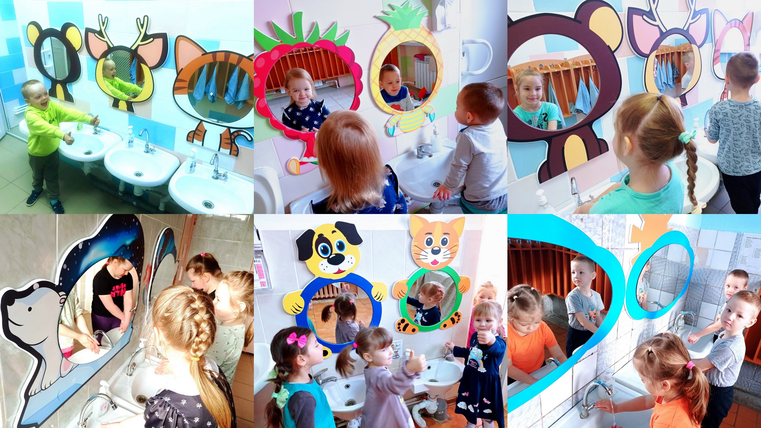 В умывальных комнатах всех групп нашего детского сада появились новые зеркала. Теперь наши дети ещё больше любят умываться и причёсываться, ведь они делают это вместе с чудесными тигрятами, котятами, щенками, медвежатами и другими милыми животными, которые разместились на обрамлении зеркал. А наши малыши, наверное, представляют себя сладкими земляничками и ананасиками – ну, как тут не улыбнуться!
