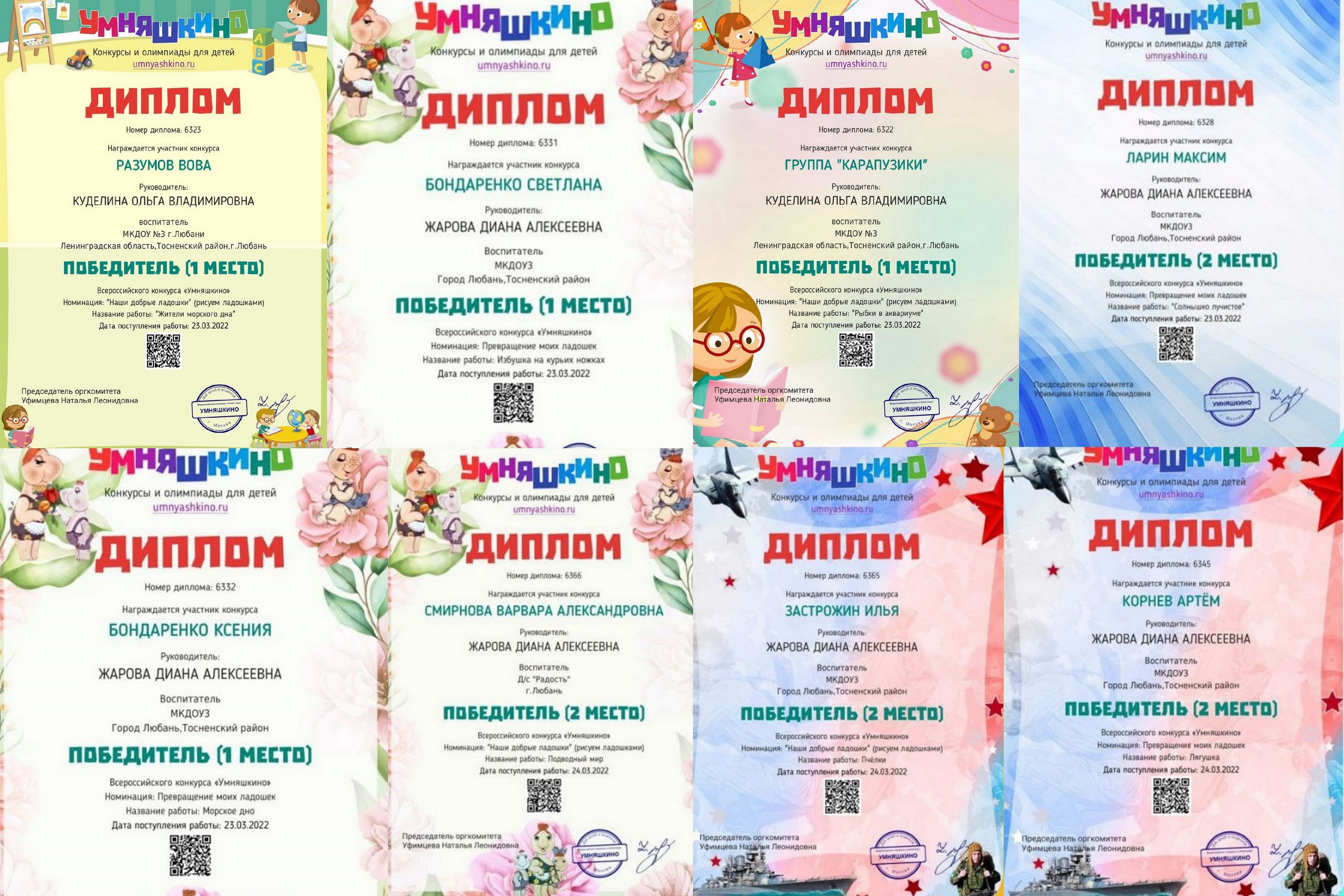 Педагоги и родители воспитанников групп «Звездочки" и "Карапузики" организуют участие детей в различных творческих конкурсах. Недавно работы наших детей были представлены на Всероссийском конкурсе «Умняшкино» в номинации «Наши добрые ладошки». Дипломы за второе место получили воспитанники группы «Звёздочки»: Корнев Артём, Ларин Максим, Смирнова Варя, Застрожин Илья. Первое место занял воспитанник группы «Карапузики» Разумов Вова, воспитанницы группы «Звёздочки» Бондаренко Ксения и Бондаренко Светлана. Красивые получились работы, а совместное творчество, общение детей и родителей бесценно!
