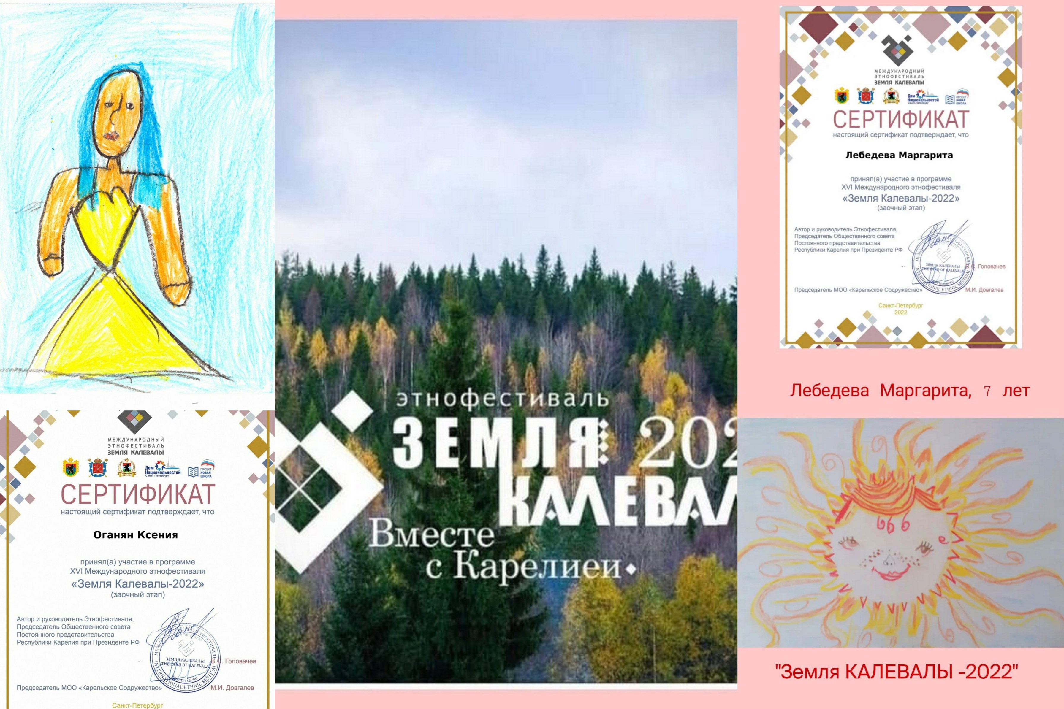 Этнофесиваль «Земля Калевалы» проводится ежегодно, начиная с 2006 года и является самой крупной совместной культурно-просветительской инициативой Республики Карелия, Москвы, Санкт-Петербурга и Ленинградской области, посвященной истории, самобытной культуре и традициям Карелии, выдающемуся памятнику культуры – карело-финскому эпосу «Калевала».Воспитанницы подготовительной группы "Знайки" Маргарита Лебедева и Ксения Оганян приняли участие в конкурсе детского творчества "Калевала - страна солнца" в рамках этнофестиваля "Земля Калевалы"-2022. Ксения прошлым летом побывала в Карелии, была впечатлена обилием и красотой озёр и нарисовала Фею Озера, а Маргарита подарила всем нам Щедрое Солнце Земли.