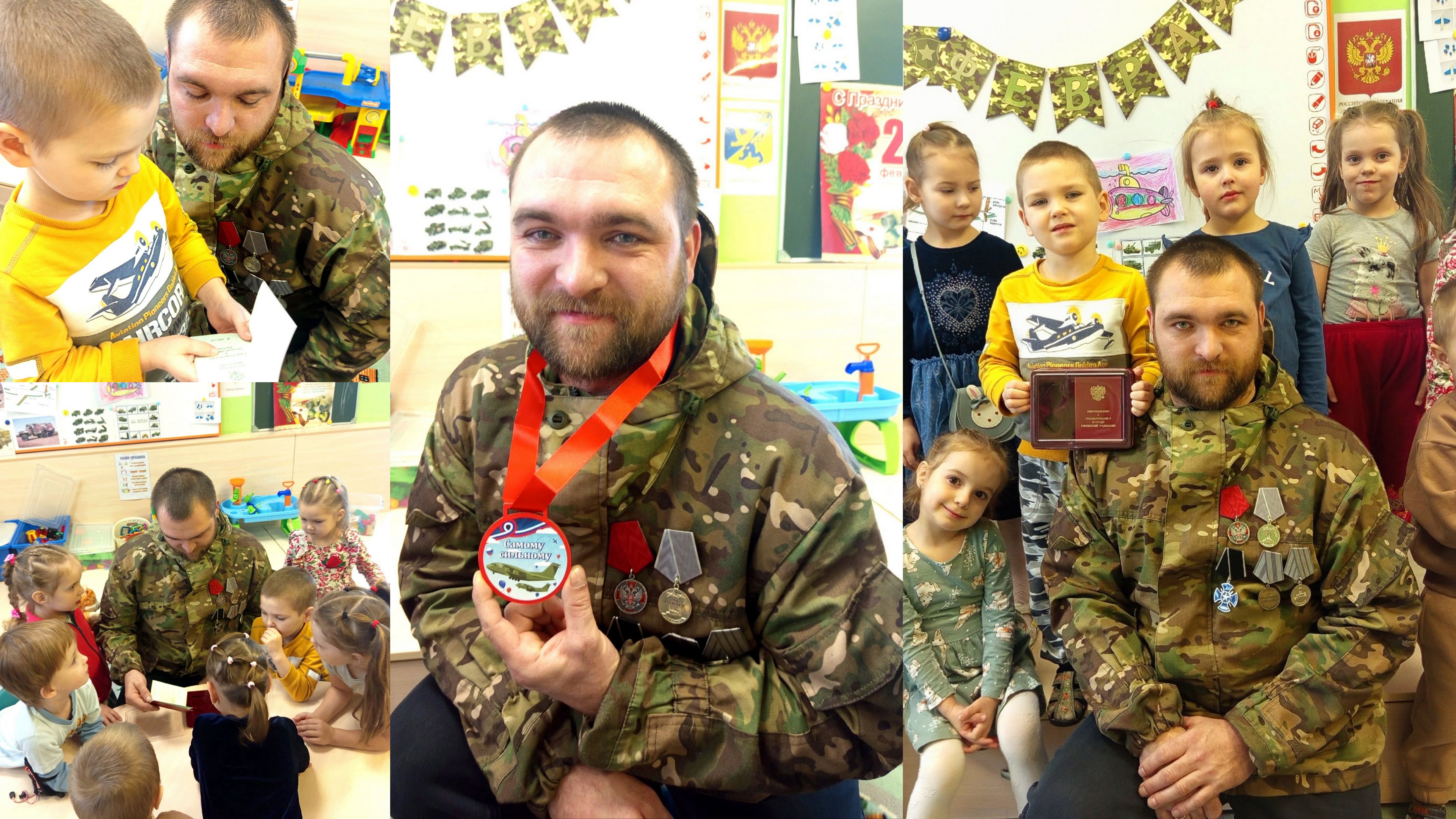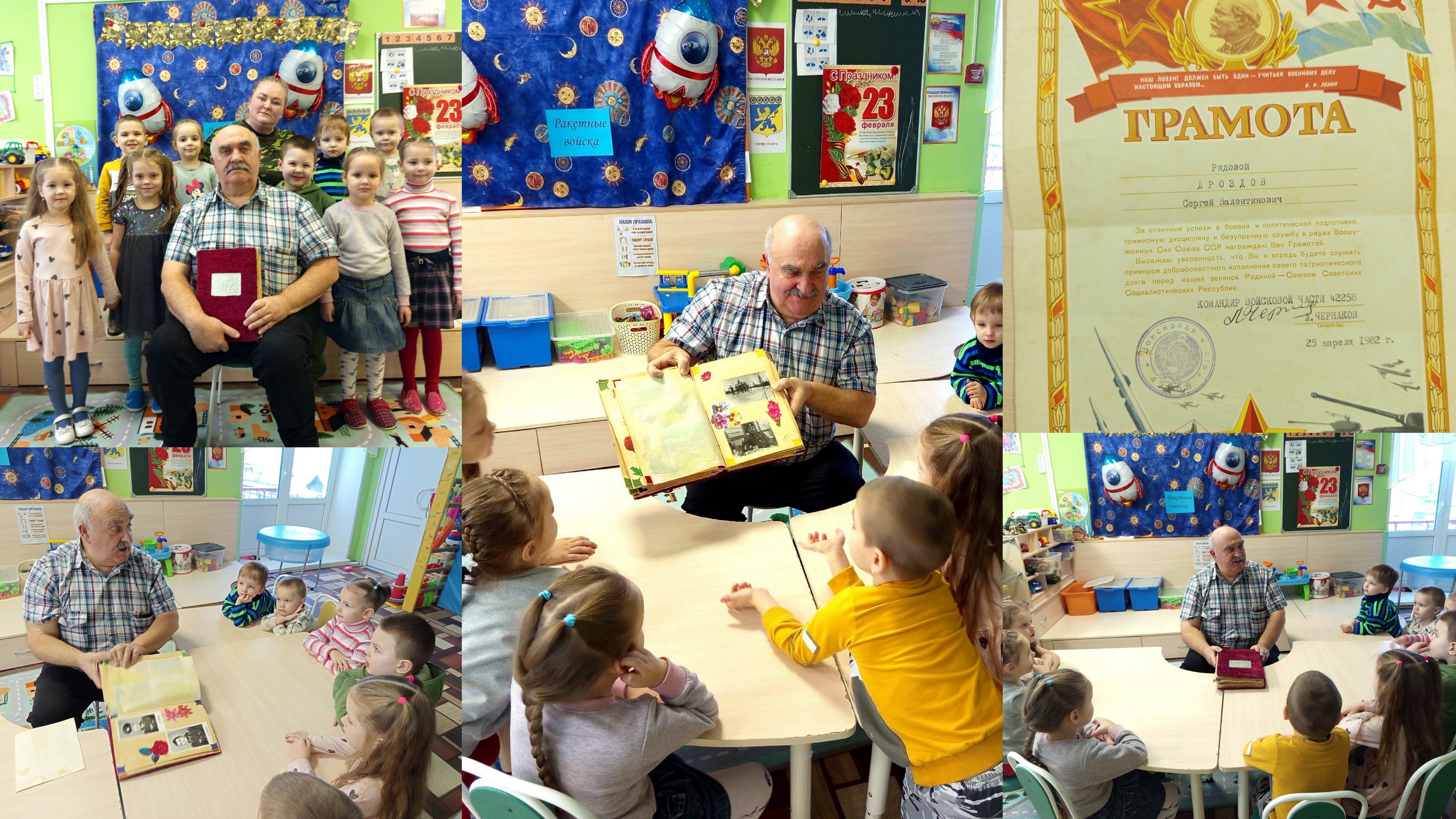 Сегодня в группе "Сказка" состоялась встреча воспитанников с Павлюченковым Дмитрием Андреевичем, папой Павлюченкова Павла. Дмитрий Андреевич защищал нашу Родину в разное время в течение нескольких лет. Награждён медалью "За отвагу", государственной наградой Российской Федерации, которую ему вручили за мужество и отвагу, проявленные в боях и при выполнении специальных заданий по обеспечению государственной безопасности.