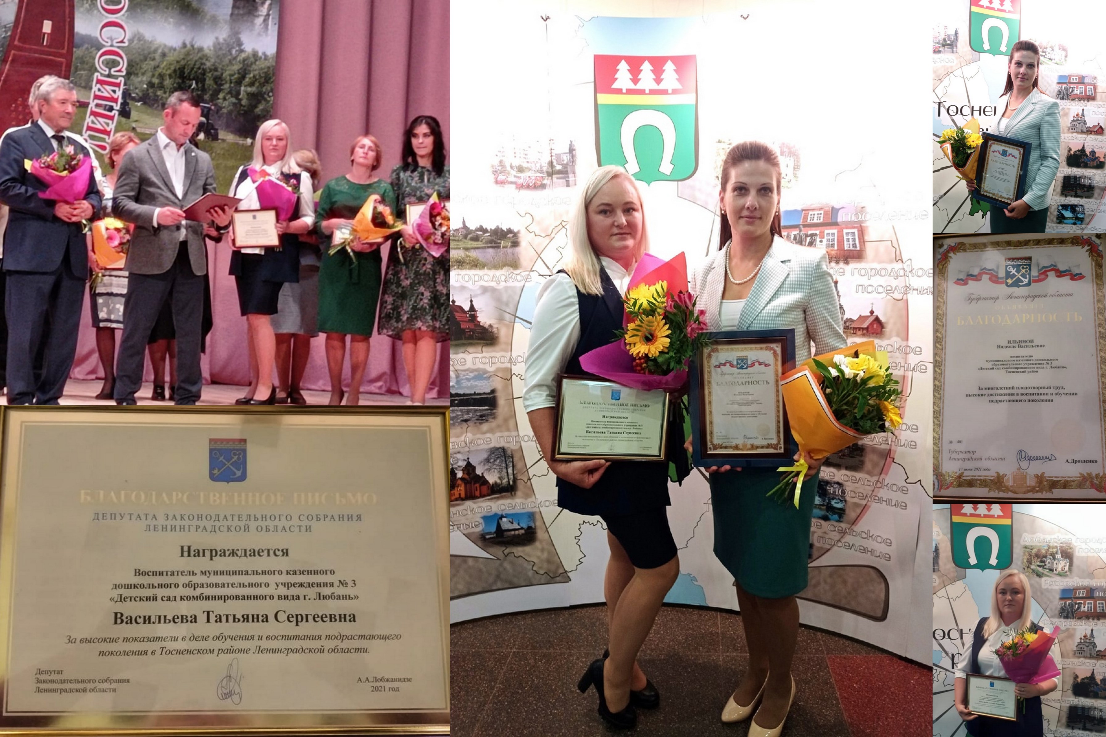 Сегодня, 27 августа 2021 года, в Тосненском дворце культуры состоялся районный педагогический совет. Традиционно в рамках этого мероприятия звучат слова благодарности всем педагогическим работникам и вручаются награды лучшим педагогам Тосненского района. В этом году высоких наград были удостоены два педагога нашего детского сада. За многолетний плодотворный труд, высокие достижения в воспитании подрастающего поколения воспитатель Ильина Надежда Васильевна награждена Благодарностью губернатора Ленинградской области. Воспитателю Васильевой Татьяне Сергеевне вручена Благодарность депутата законодательного собрания Ленинградской области за высокие показатели в деле воспитания и обучения подрастающего поколения. Мы гордимся нашими педагогами и желаем им крепкого здоровья, семейного благополучия, счастья, дальнейших успехов в профессиональной деятельности!