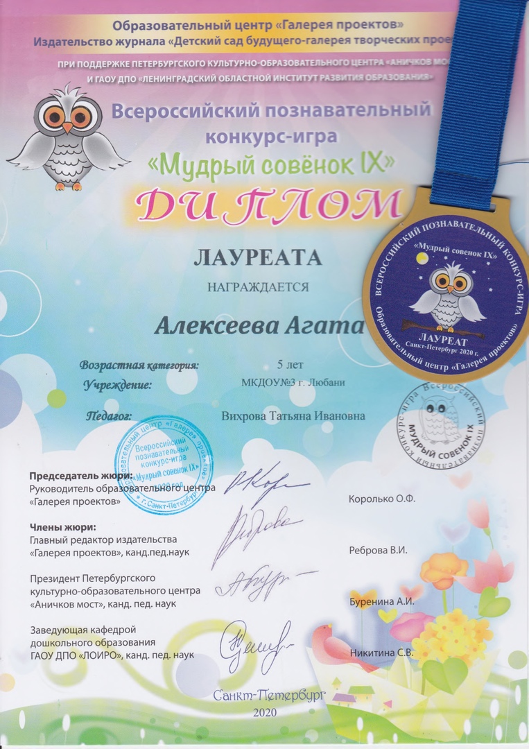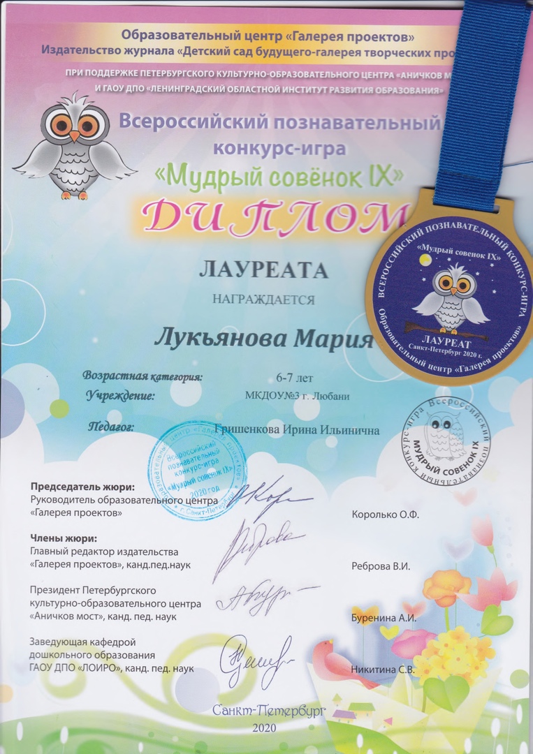 В нашем детском саду лауреатами конкурса стали Лукьянова Мария (возрастная категория 6-7 лет) и Алексеева Агата (возрастная категория 5 лет). Нашим лауреатам вручены дипломы и медали!