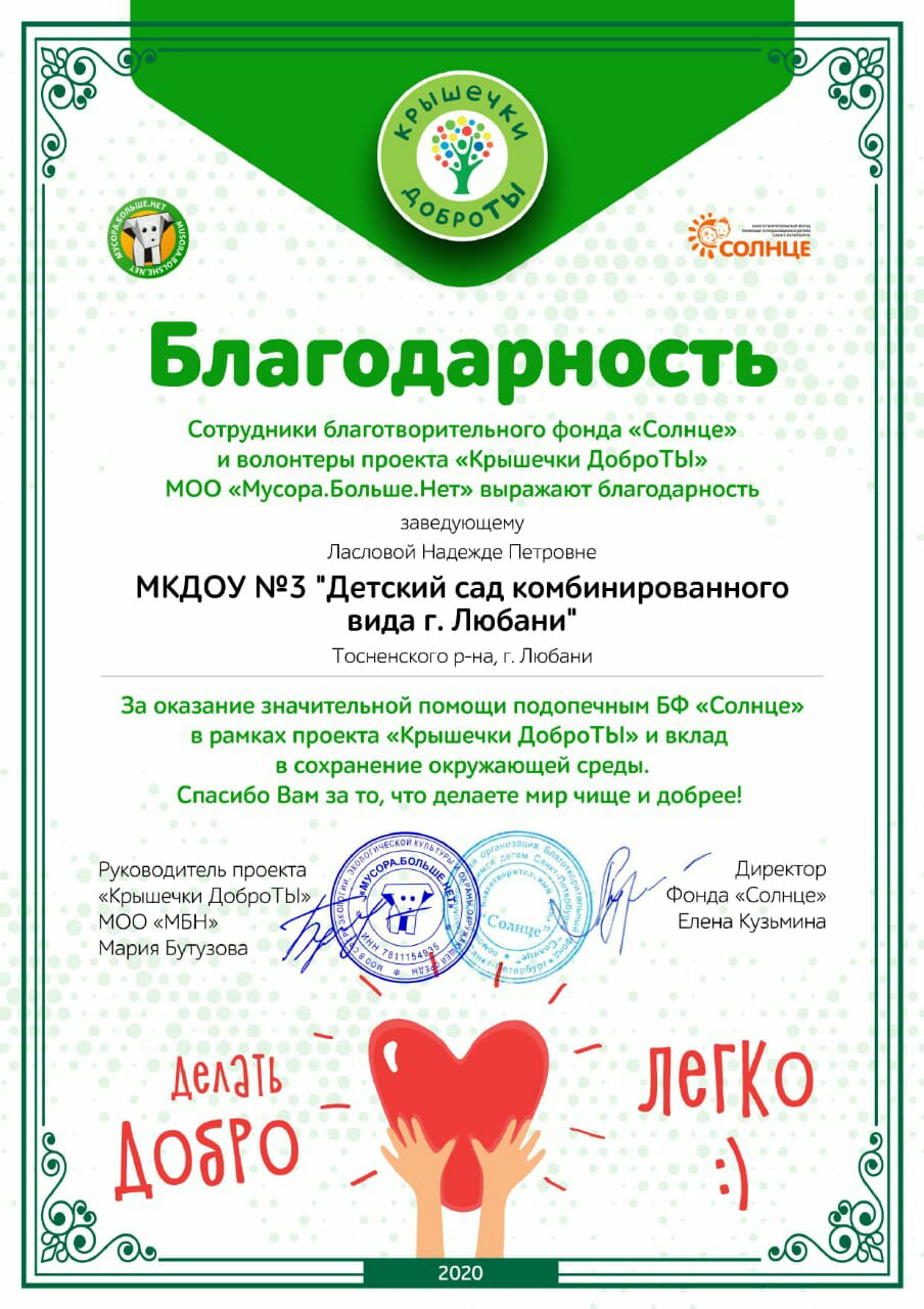 В течение года воспитанники, родители, сотрудники, друзья собирали пластиковые крышечки и мы собрали их немало - 42 килограмма! Средства, вырученные от сдачи пластика, были переданы в благотворительный фонд "Солнце". Наши усилия были высоко оценены руководителями проекта. А мы благодарны за то, что наши дети, да и мы, взрослые, получили возможность защищать природу и помогать людям! Благодарим координатора проекта в нашем учреждении Ильину Надежду Васильевну и, конечно, всех его всех участников!