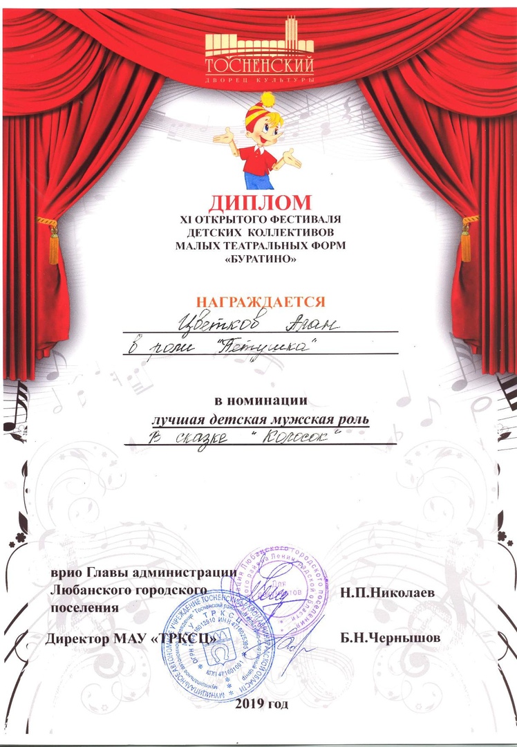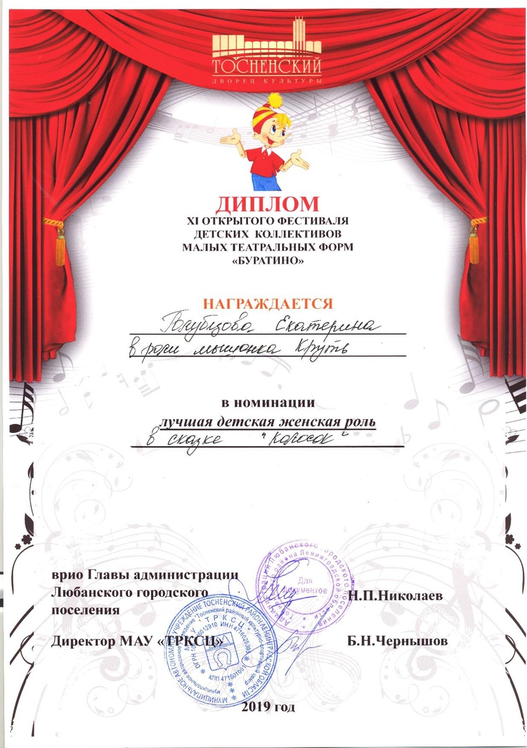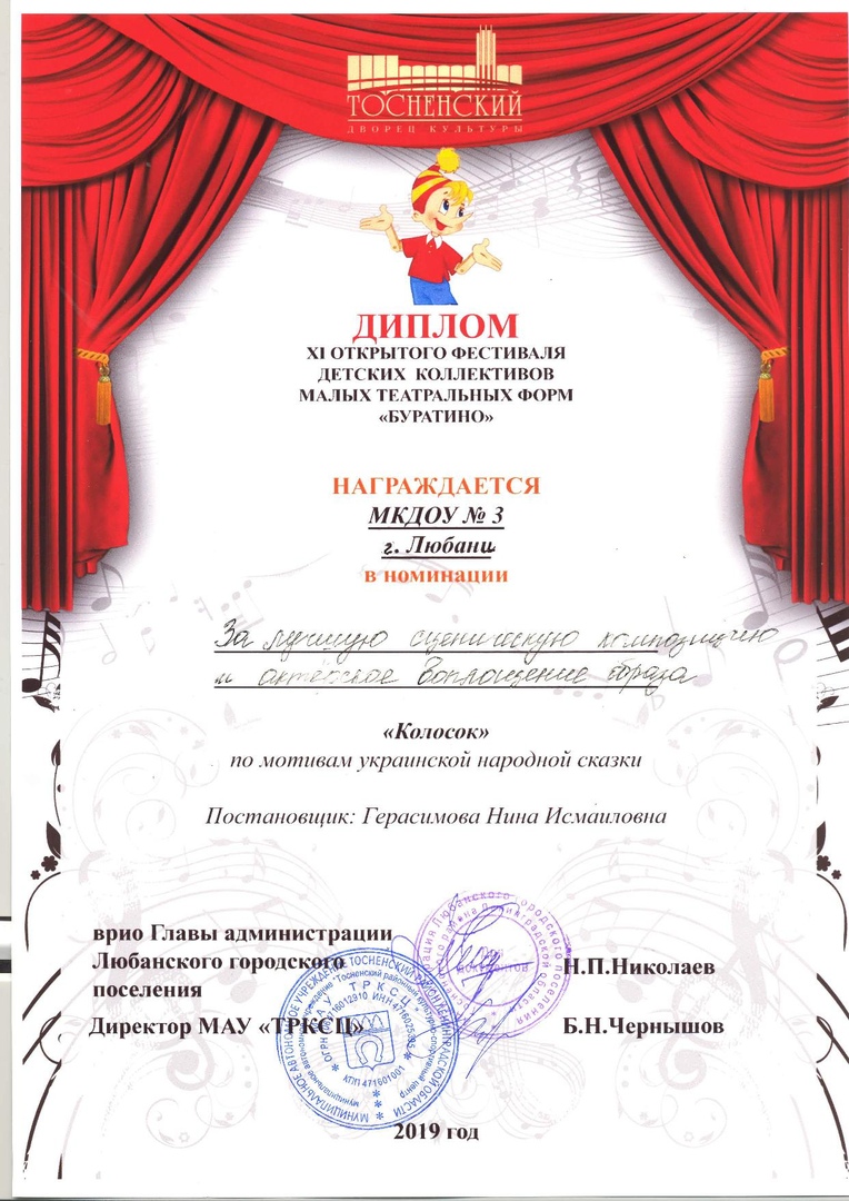 Сегодня, 23 октября 2019 года, в Любанском городском поселении состоялся XI открытый фестиваль детских коллективов малых театральных форм «БУРАТИНО». Выступление творческой группы "Радость" МКДОУ № 3 г. Любани под руководством Герасимовой Нины Исмаиловны было одним из лучших!