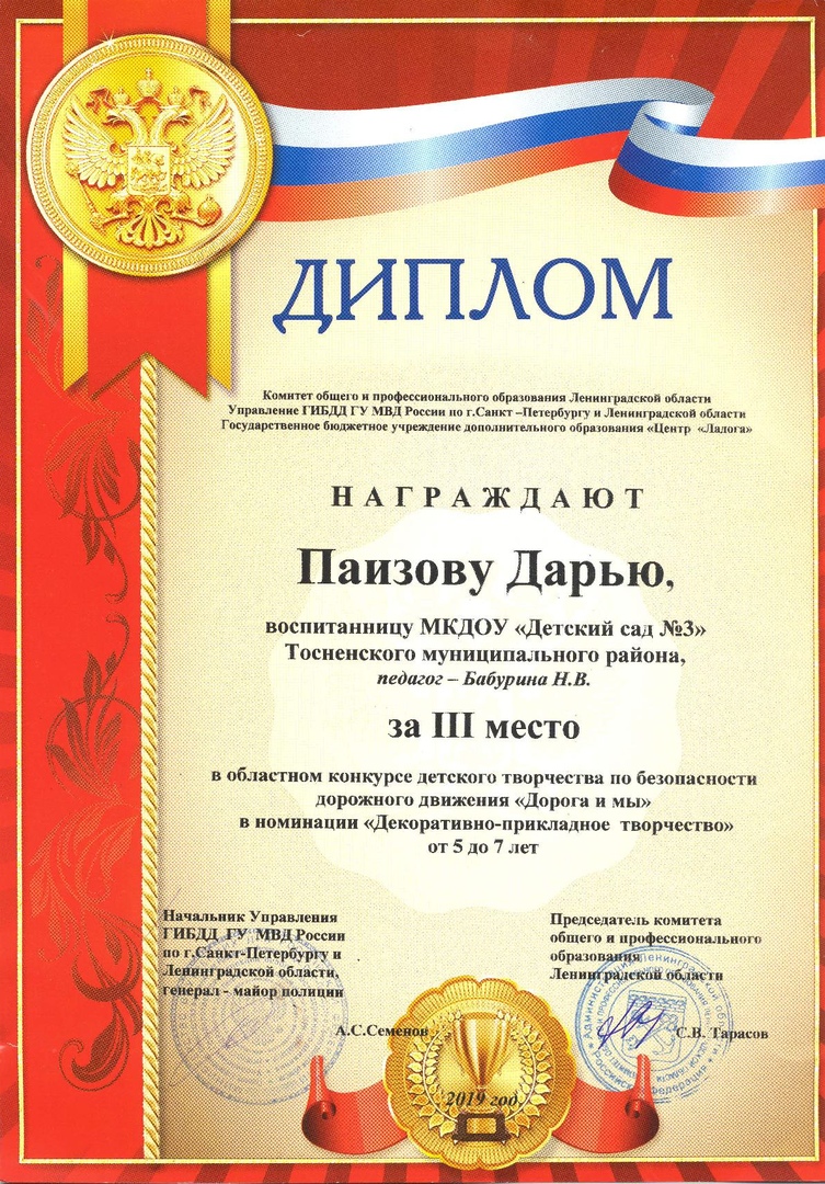 Воспитанница нашего детского сада (в настоящее время - выпускница, первоклассница) Паизова Дарья (педагог Бабурина Наталья Викторовна) в 2019 году стала победителем районного конкурса "Дорога и мы". И вот совсем недавно мы узнали о том, что Комитет общего и профессионального образования Ленинградской области, Управление ГИБДД ГУ МВД России по Санкт-Петербургу и Ленинградской области удостоили Дашу Диплома за III место в областном конкурсе детского творчества по безопасности дорожного движения "Дорога и мы" в номинации "Декоративно-прикладное искусство".
