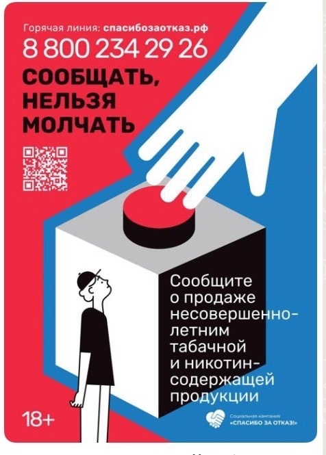 Если вы знаете, где несовершеннолетним продают сигареты или вейпы, сообщите на «горячую линию» 8-800-234-29-26 или пишите через сайт спасибозаотказ.рф