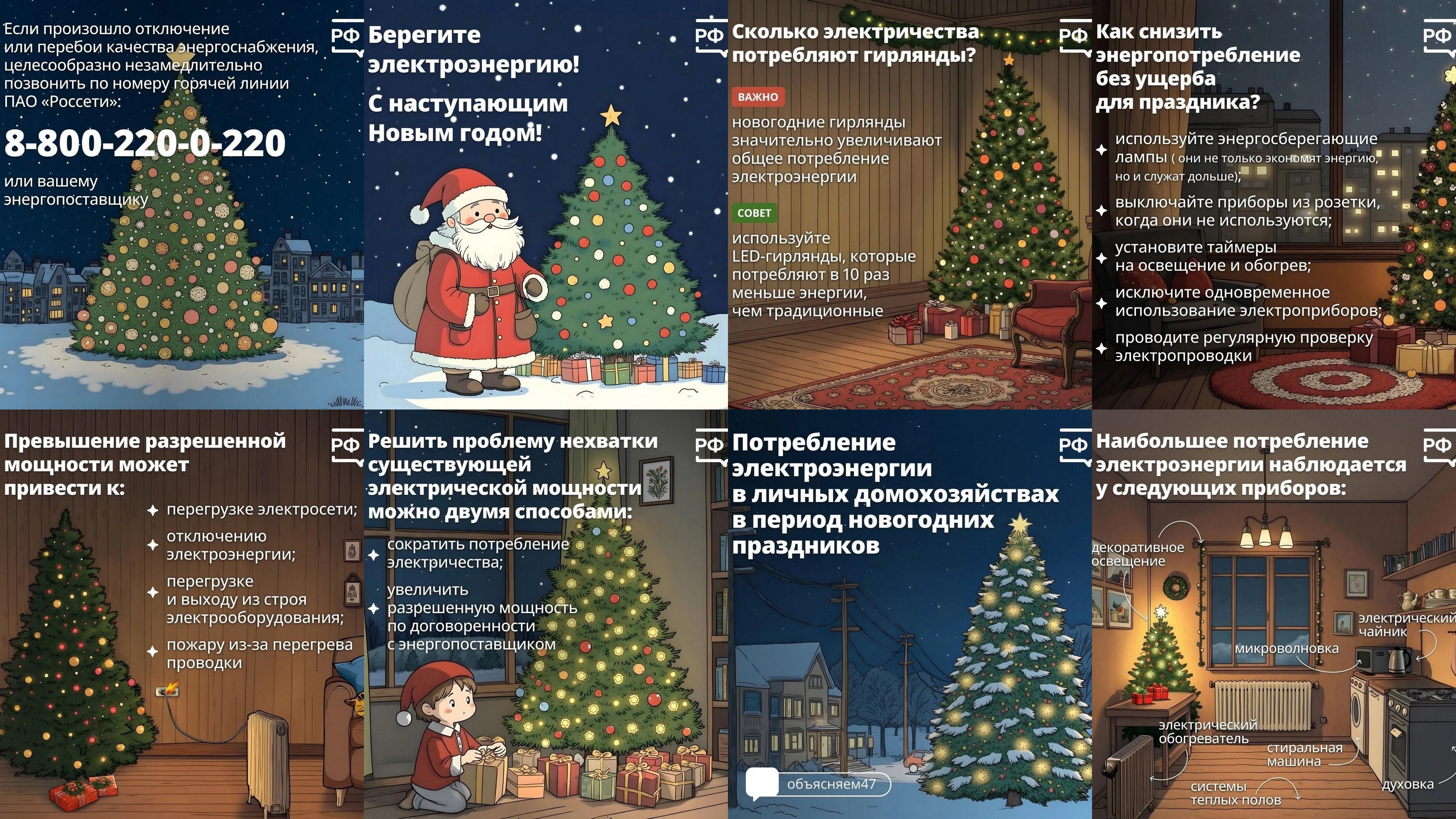 В новогодние праздники важно быть внимательнее при использовании электроприборов. Многочисленные гирлянды, лампы, чайники, компьютеры и многое другое — большое количество одновременно работающих приборов, может привести к перегрузке сети и отключению электричества. Чтобы вам удалось сохранить атмосферу праздника, делимся в карточках полезными советами.