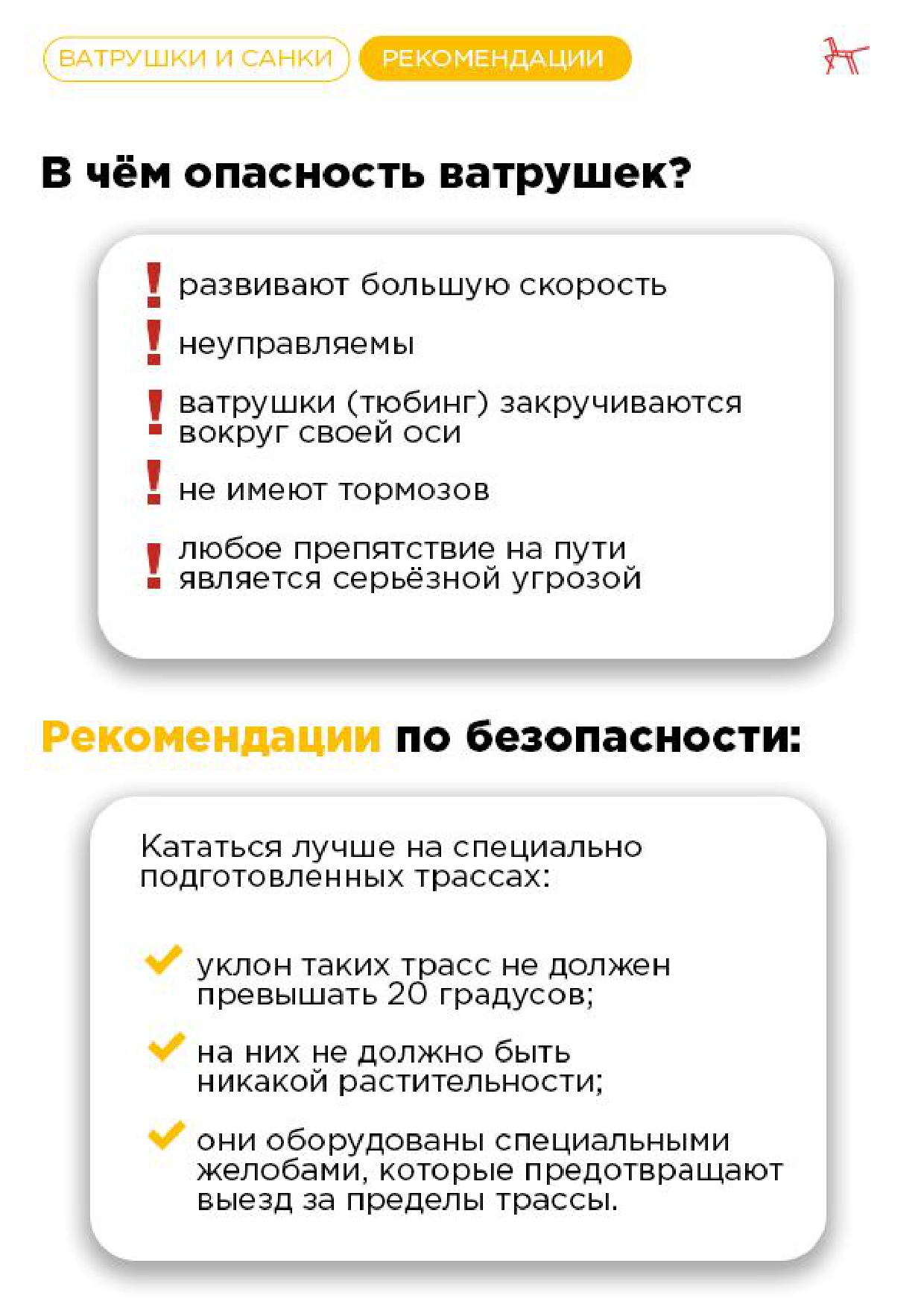 МЧС России подготовили для вас правила безопасности при катании на тюбингах. В карточках вы найдёте ключевые аспекты безопасного катания на ватрушках. Изучите сами, объясните детям и поделитесь с друзьями!